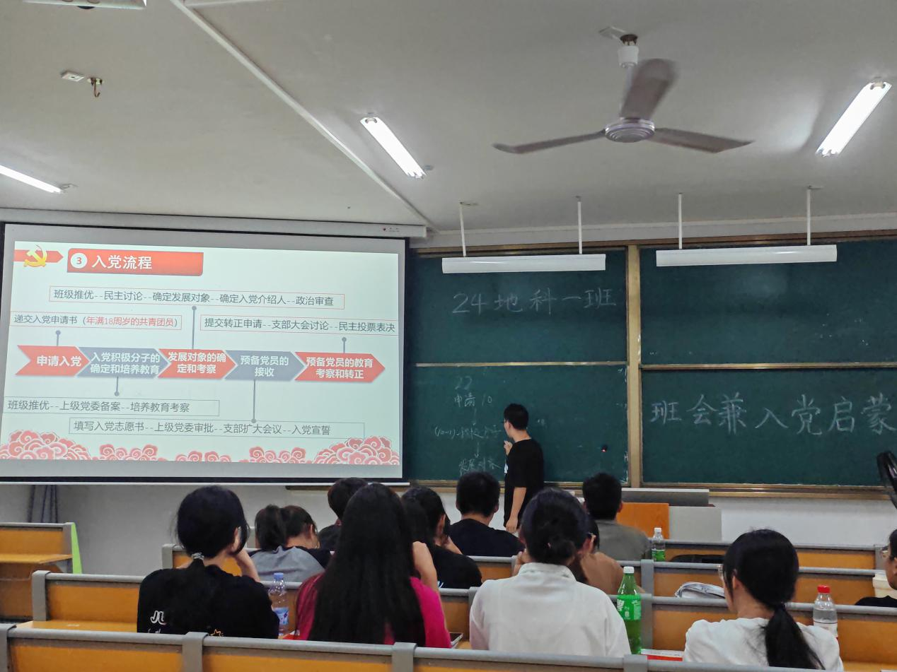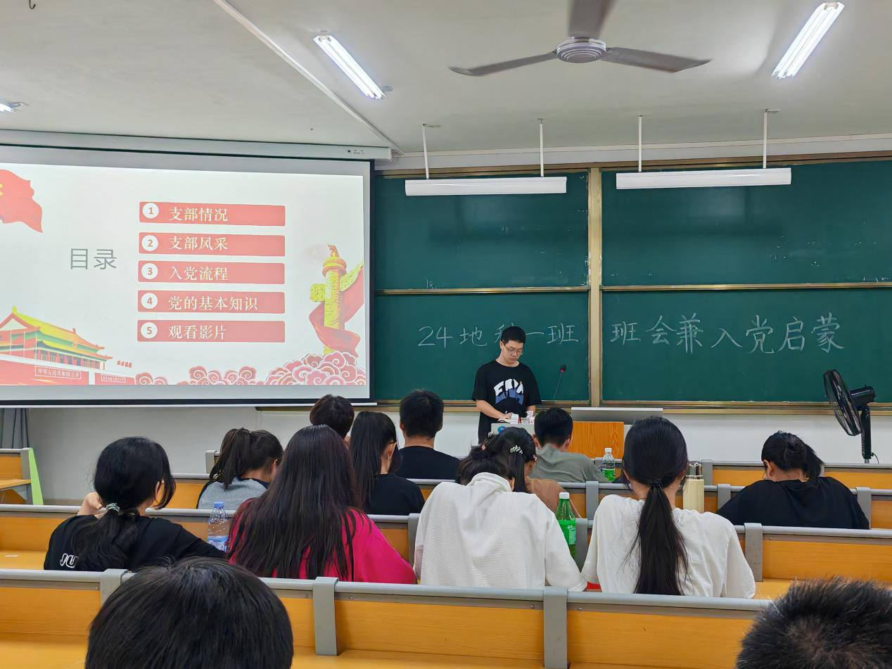 为加强新生思想政治教育,引导新生积极向党组织靠拢,2024年9月20日,6686体育24地科类一班于武鸣校区实验楼2-A202开展入党启蒙教育活动。本次会议活动由班级驻党李佳臻同志、韦涵升同志共同主持,全体同学参与。