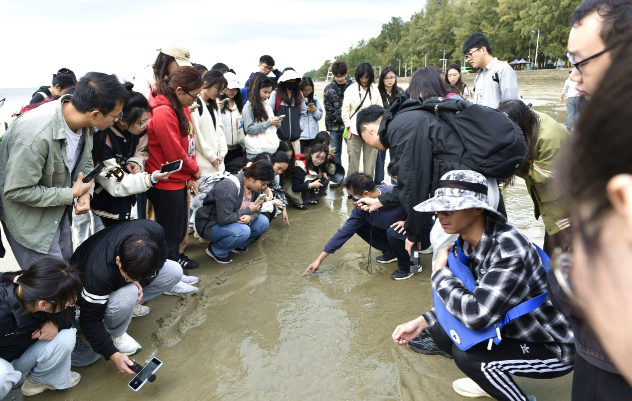 研学队伍在防城港金滩观察沉积物的搬运特征