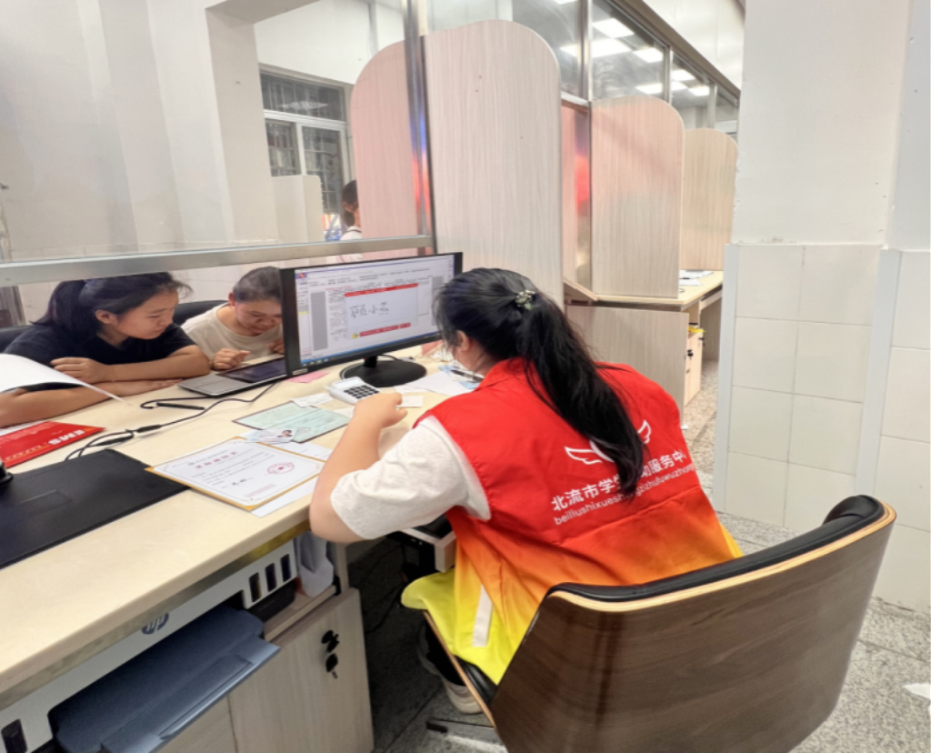 黄雪婷同学在北流市资助服务中心参与助学贷款志愿工作,期间负责材料核验、政策答疑与流程引导的合同类工作,为每一个申请贷款的学生提供帮助。