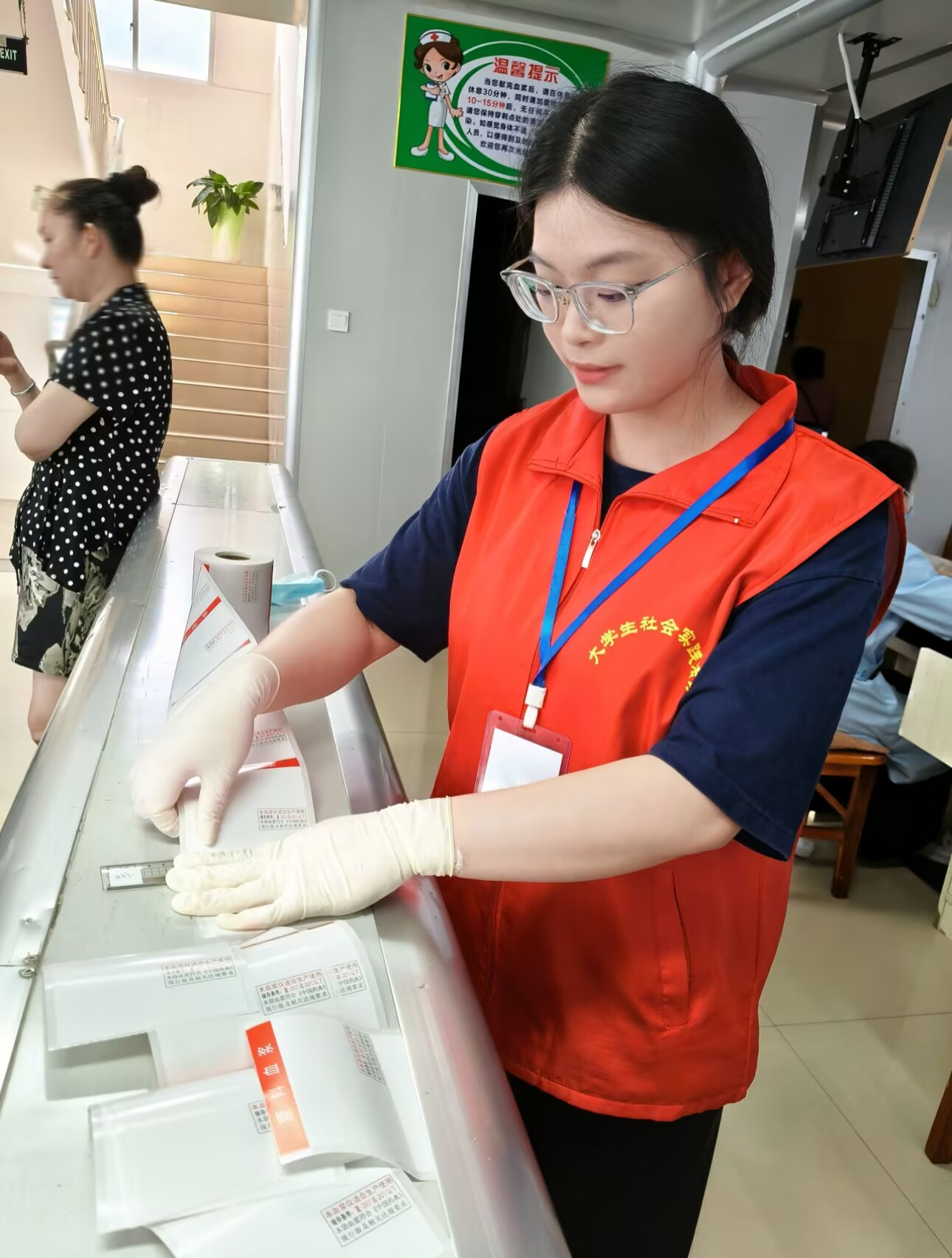李妙玲同学在血浆站进行志愿实践,日常对积极无偿献血的居民进行信息登记、体检项目,同时协助医护人员进行血浆采集,确保每一步都进行得细致无误。
