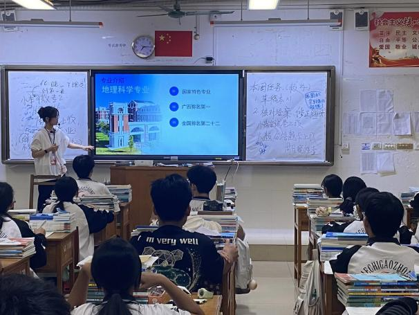 实习老师韦英娟与胡佳琦,以南宁师范大学6686体育的地理科学专业为切入点,开展了“我的大学”主题班会,既系统介绍了学科建设成果,又生动展现了地理学科的探索乐趣。这场分享不仅帮学生搭建了清晰的学科认知框架,更通过描绘大学丰富多彩的学习生活,点燃了大家对未来的向往,进一步激发了当下发奋学习的动力。