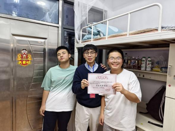 (实习老师梁骅与卫生优秀宿舍学生合照)