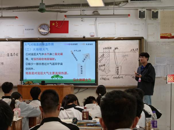 以理论为纲,以实践为目,将课本中的知识要点转化为课堂教学的具体实践,使理论在真实教育场景中落地生根。经过集体备课、相互磨课,实习生们在课堂中展现出扎实的教学基本功,他们巧妙运用多媒体资源创设情境,通过动态图解演示大气受热过程中太阳辐射、地面辐射和大气辐射的相互作用,引导学生自主观察、思考并总结规律。