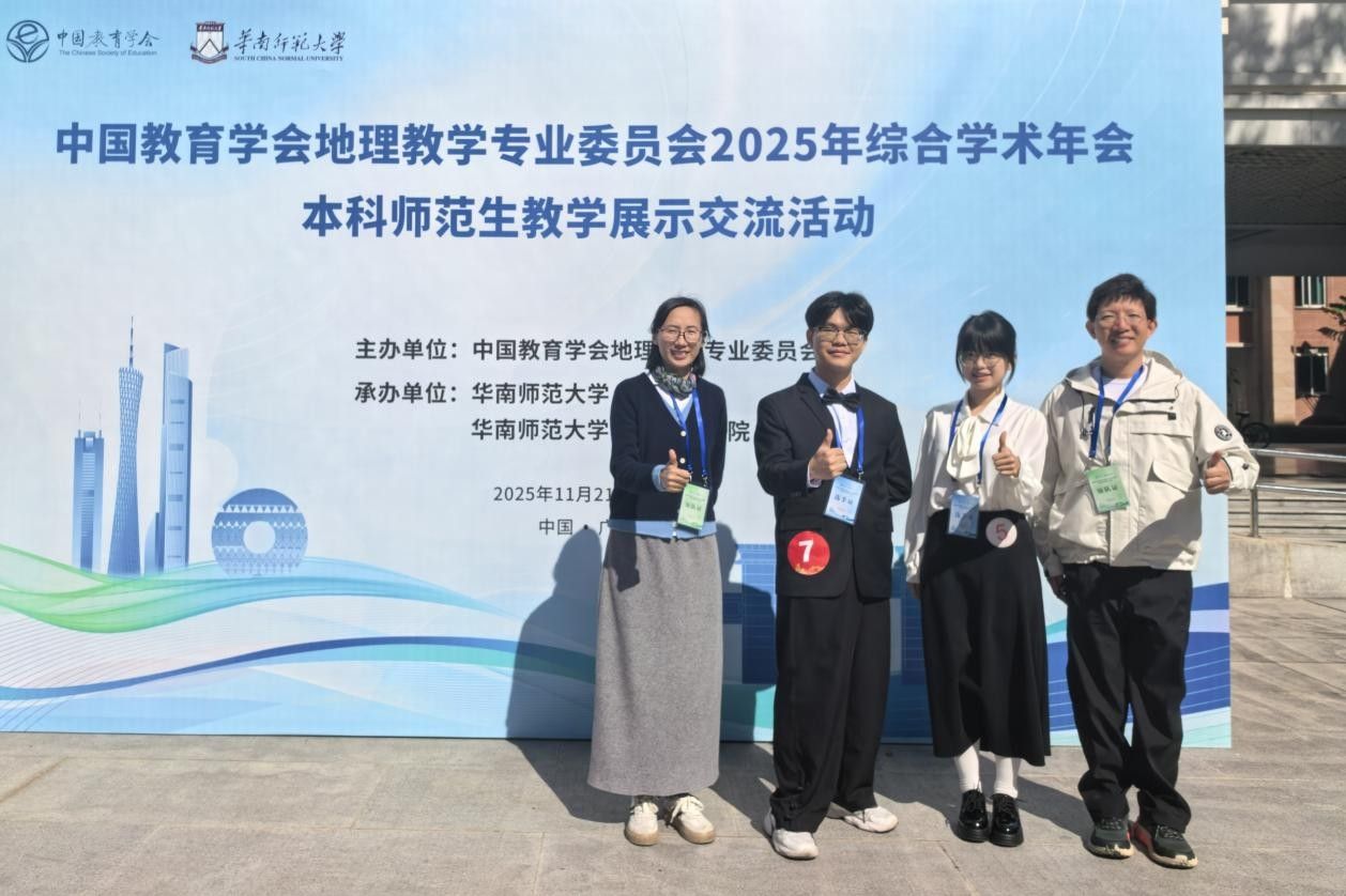 11月21—26日,中国教育学会地理教学专业委员会2025年综合学术年会在广州召开。会议期间,举行了包括高校地理师范生教学技能展示交流活动、高师地理学术研讨、中学地理教师教学交流展示、大会特邀报告及学术论坛等多项重点活动。我校地理科学专业高度重视本次学术年会,派出师生代表参加会议。在地理师范生教学技能展示交流活动中,我校学子表现出色,覃海锋、江少婕分别获得“参加大会展示”与“参加分会场展示”的学术证明。通过系列高端学术活动,我校师生代表与全国同行深入交流,探讨了地理教育的前沿动态与未来图景,增进了校际友谊。