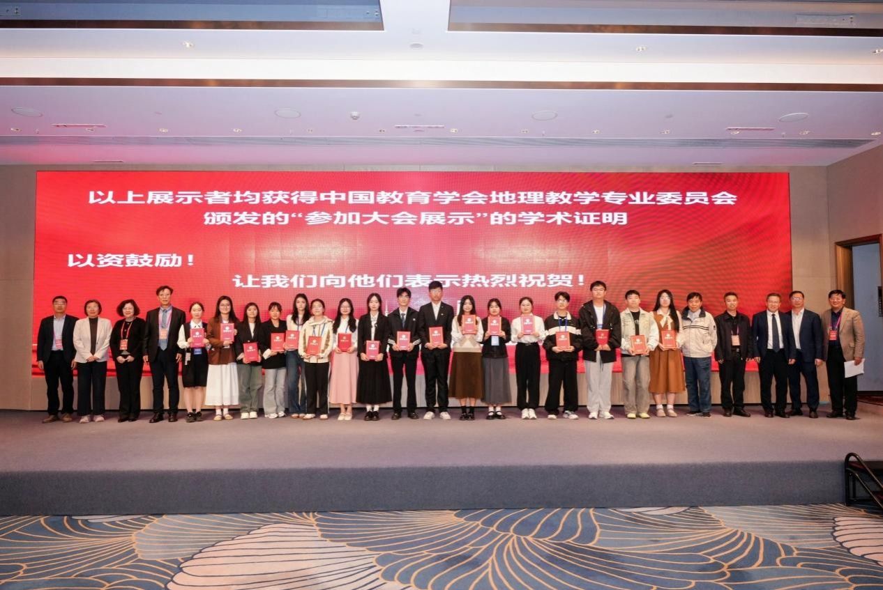 23—26日,我校地理师生代表还参加了学术年会的其他多项活动。其中23日下午的“全国高师地理学术探讨”,聚焦师范院校地理专业的改革与创新,为地理学科优化人才培养方案、强化师范特色提供了宝贵思路,其中“人工智能赋能地理教学”的专题报告,揭示了AI技术重塑未来课堂的无限可能,为未来我校地理教学改革与科研注入新动能;24日上午的学术年会开幕式与大会特邀报告,介绍了地理学科发展和地理教育研究的最新前沿与未来趋势。24下午的“中学地理教师教学交流展示”,通过走进真实课堂,观摩一线名师如何将理论转化为实践,让大家对“如何上好一堂地理课”有了更直观、更深刻的理解,也切身感受到了教学一线的活力与挑战。25日的“第二届地理教材建设与研究高峰论坛”,围绕教材的编写理念、内容创新与使用策略展开,深化了教师对国家课程资源核心载体的认识,对提升教材分析与运用能力具有重要价值。在学术年会的闭幕式上,学生代表上台获颁展示活动证明。