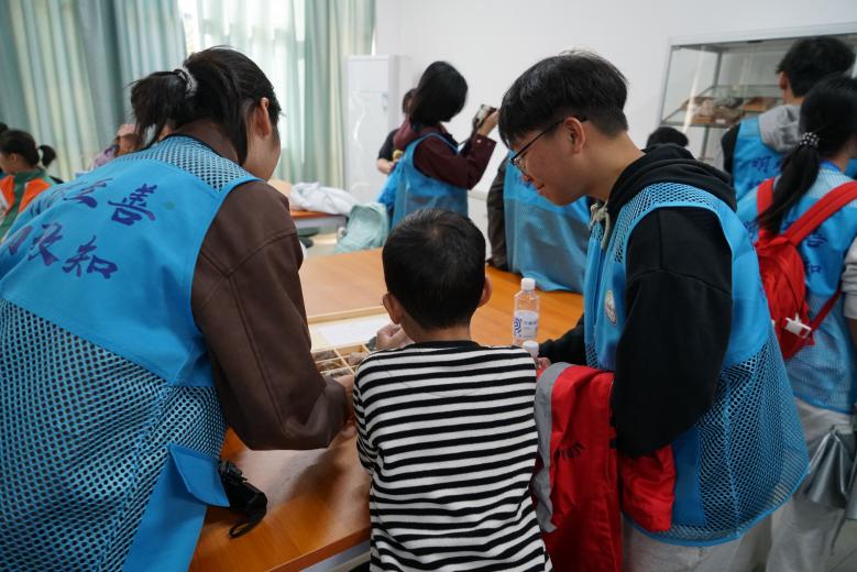 (志愿者协助小朋友观察石头标本)