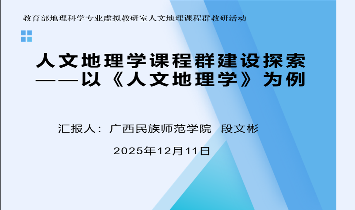 2025年12月11日晚,教育部地理科学专业虚拟教研室“人文地理课程群系列教研活动”第三期于线上顺利举行。本次活动继续围绕人文地理课程的高质量建设与教学创新展开深度研讨,由虚拟教研室负责人张胜前教授主持,吸引了来自贵州师范大学、广西民族师范学院、北部湾大学等多所高校的教师参与。
