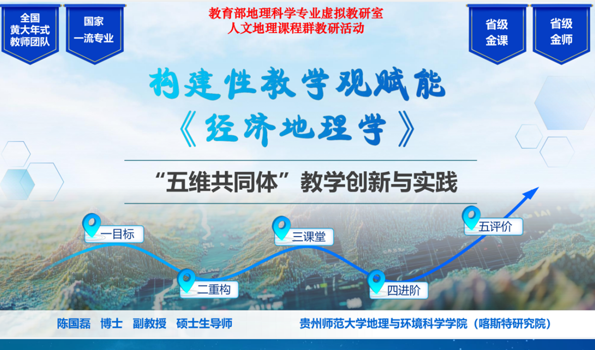 贵州师范大学陈国磊副教授作了题为《建构主义教学观赋能经济地理学线上线下混合教学创新与实践》的报告,他在介绍人文地理课程建设历程和课程目标的基础上,针对内容同质化影响特色人才培养、思政体系薄弱制约素养提升、理实链接不足阻碍高阶思维形成、评价机制单一限制学生主动性与创新发展等教学痛点,系统阐述了“一目标、二重构、三课堂、四进阶、五评价”的“五维共同体”协同育人模式,以及开展线上线下、课内课外的深度融合混合式教学创新实践。报告重点分享了如何通过知识图谱建设、在地化思政融合、三课堂联动及多元评价改革,有效提升学生的学习内驱力与高阶思维能力,并从学生能力发展、教师团队发展和课程建设成效几个方面总结了改革的育人成效和示范推广意义。