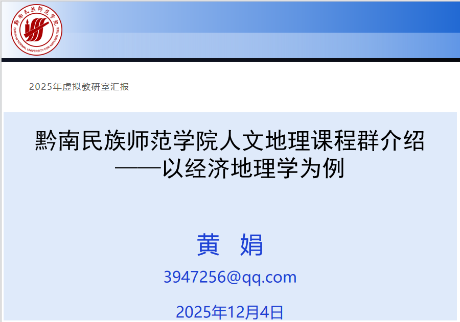 黔南民族师范学院黄娟老师作了题为《黔南民族师范学院人文地理课程群介绍——以经济地理学为例》的报告,系统介绍了该校课程群在课程定位、课程目标、课程内容、课程实施、课程评价、课程特色与展望等方面的建设经验。她重点分享了如何通过“点—线—面”联动的实践教学体系,将课程实践、野外实习与地方产业发展相结合,培养学生的地理实践力与综合思维。黄老师还展示了如何依托三线建设博物馆、少数民族工艺村等地方资源开发乡土课程,有效促进了高等教育与基础教育的衔接。