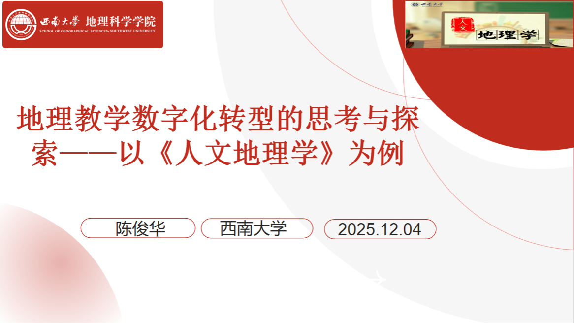 西南大学陈俊华老师作了题为《地理教学数字化转型的思考与探索——以《人文地理学》为例》的报告,他从时代背景与教学现实出发,分析了数字化转型的必然性,阐释了地理教学数字化转型的科学内涵与基本原则,并以《人文地理学》课程为例,系统介绍了数字化转型的实践路径、相关反思与未来展望。结合数字原生代学生的学习特点,他提出应通过教材资源数字化、混合式教学、虚拟现实技术应用等方式,推动教学从“以教为中心”向“以学为中心”的转变。陈老师指出,数字化转型不是终点,而是教学改革的新起点,其根本目的在于服务于学生成长与高素质人才培养。