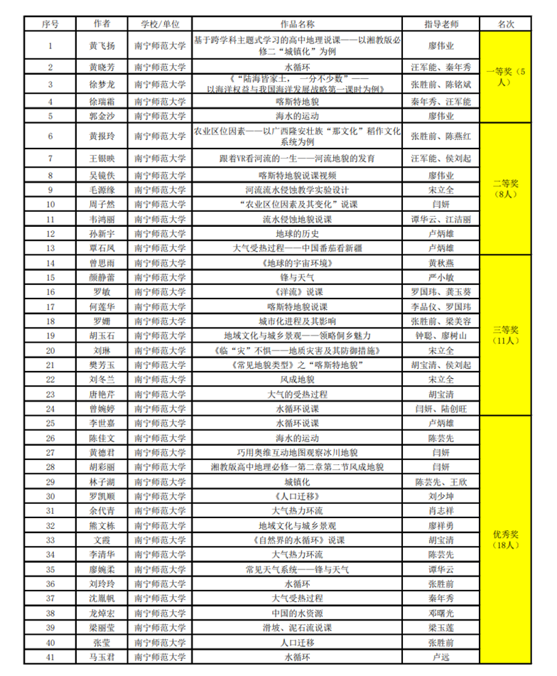 南宁师范大学6686体育学科教学(地理)专业硕士研究生在此次说课大赛中表现优秀,于众多选手当中脱颖而出,共斩获硕士组一等奖5项、二等奖8项、三等奖11项以及优秀奖18项。这些荣誉,都是每一位参赛选手不断努力、不断探索、不断突破自我的结果。具体获奖情况如下: