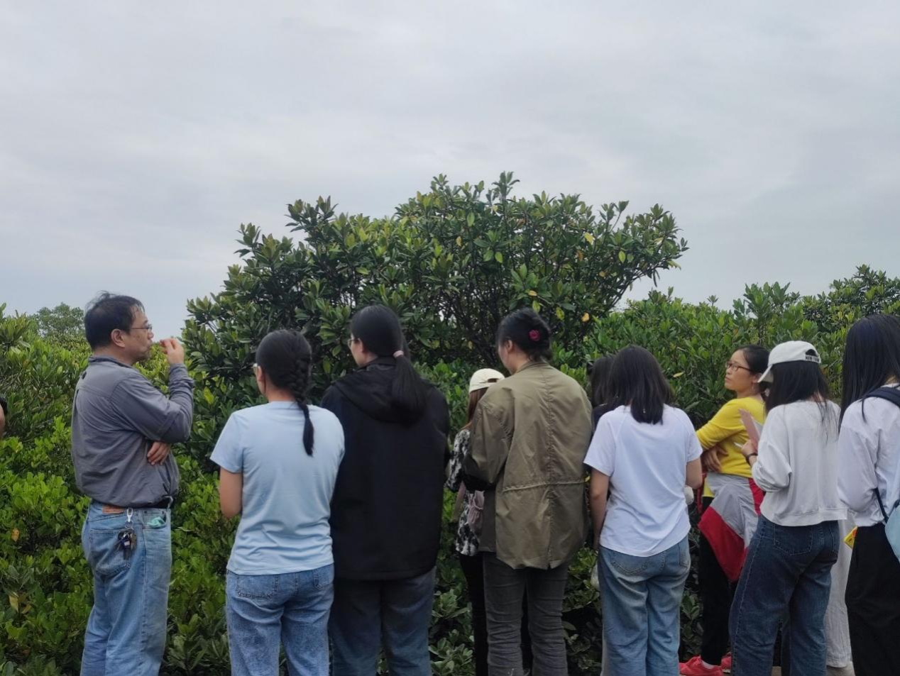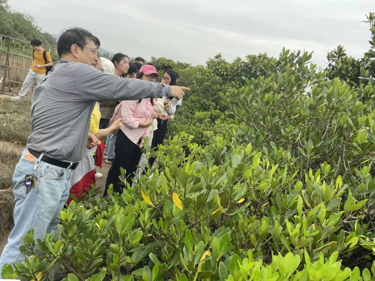 考察第二站,同学们来到了防城港的石角红树林,经过本次带队老师的介绍和结合同学们的调研前的资料收集,同学们了解“海岸卫士”及其生态作用和生态价值等方面的知识。