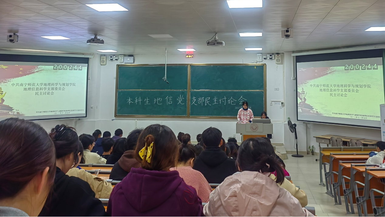 2023年12月5日星期二,6686体育本科生地信党支部在南宁师范大学武鸣校区2号教学楼109教室如期召开民主讨论会。本次会议由綦文嘉同志和张子涵同志主持,本科生地信党支部全体党员和各班积极分子共同参会。