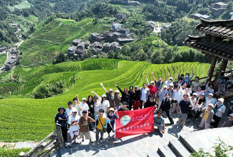 9月4日上午,全体师生抵达了龙胜各族自治县的龙脊梯田。在实地观察中,同学们深入探讨了龙脊梯田的形成条件:该地位于亚热带季风气候区,年降雨量高达1600~1700毫米,为梯田提供了丰富的灌溉水源。同时,龙脊梯田地区地貌以中山为主,土壤粘性强、保水性好,加之高山深谷的地形地貌,为梯田的开垦创造了得天独厚的条件。在攀爬梯田的过程中,师生们不仅领略了梯田的壮观景象,还深入探寻了当地壮族、瑶族人民历史悠久的农耕文化,以及人与自然和谐共生的生动例证。此外,同学们还探讨了梯田土壤保持水分的奥秘、龙脊梯田水稻的特殊种植时间,以及当地人对梯田的保护与旅游开发现状,对当地独特的自然地理环境和人地关系受经济活动的影响有了更直观的认识。