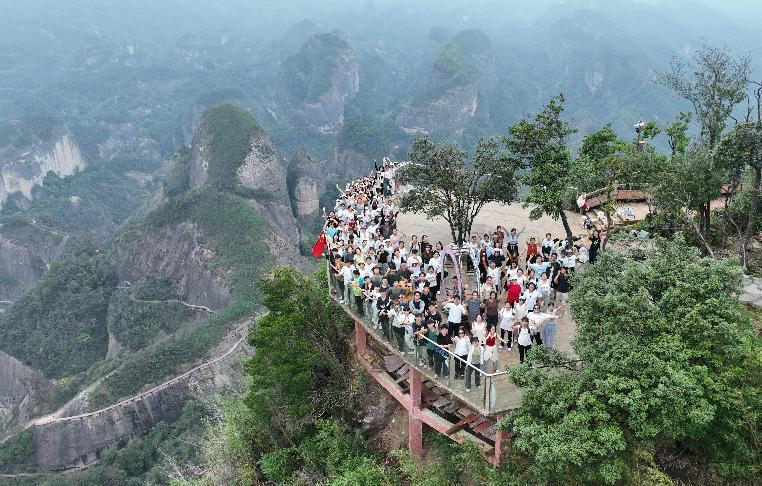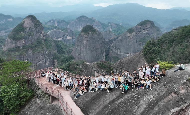 9月7日上午,师生们攀登了中国最美七大丹霞之一的八角寨。八角寨保护区内保存着6700万年前的白垩纪红色砂砾岩,在地表流水的侵蚀下,形成了国内罕见的典型丹霞地貌景观。在曾长育老师的精心讲解下,同学们深入学习了八角寨的岩石组成、岩石产状的特点及测量方法。通过野外观察和实地考察,同学们对陆相砂砾岩的沉积特点有了更深入的了解,现场观察了水平构造、垂直节理对丹霞地貌形成的影响,深化了对八角寨岩石和地貌的认知。