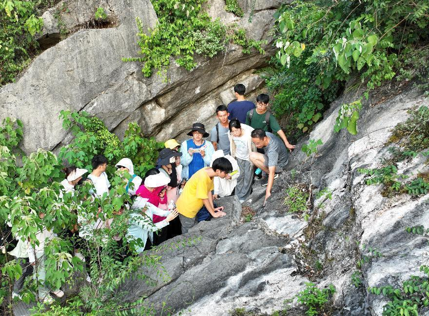 在实习期间,师生们还探访了多处喀斯特地貌景观,系统了解了地上喀斯特和地下喀斯特的成因和特点。9月4日下午,一行人来到南边村国际D/C界线地质遗址保护区,发现了众多古生物化石,了解了泥盆纪与石炭纪的地层界线及其在国际地质科学界的重要地位。9月6日上午,师生们寻访了漓江源大峡谷,深入调查了漓江源地貌的形成过程,探讨了峡谷区毛竹与周边大尺度区域的环境差异对该地生态系统、当地居民的影响,以及源头水的开发和保护现状。9月8日下午,在阳朔县兴坪镇境内的幸福源水库双线特大桥上,师生们就两侧山峰呈现出的截然不同特征进行了现场讨论,分析了该岩溶区喀斯特地貌“同时异态”的形成过程。9月3日下午,实习队伍首先来到了桂林市临桂区的会仙喀斯特国家湿地公园,同学们在小组汇报后,带着梁浩原老师提出的问题——为什么喀斯特地区通常保水难,而会仙这里却能形成湿地——在乘船和爬山途中寻找答案,这一过程不仅加强了同学们对地质地貌知识的理解与运用,还树立了保护环境的意识。
