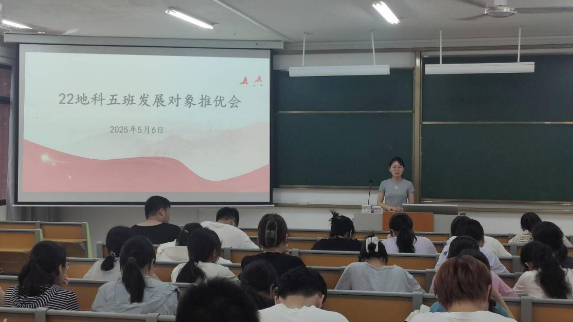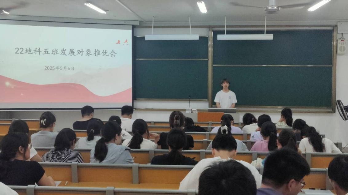 5月6日,6686体育22级地科5班和地科专升本班在武鸣校区二号实验楼A304教室召开发展对象推优会。会议由团支书李朔燕主持,驻党李霞、杨通立列席参与。