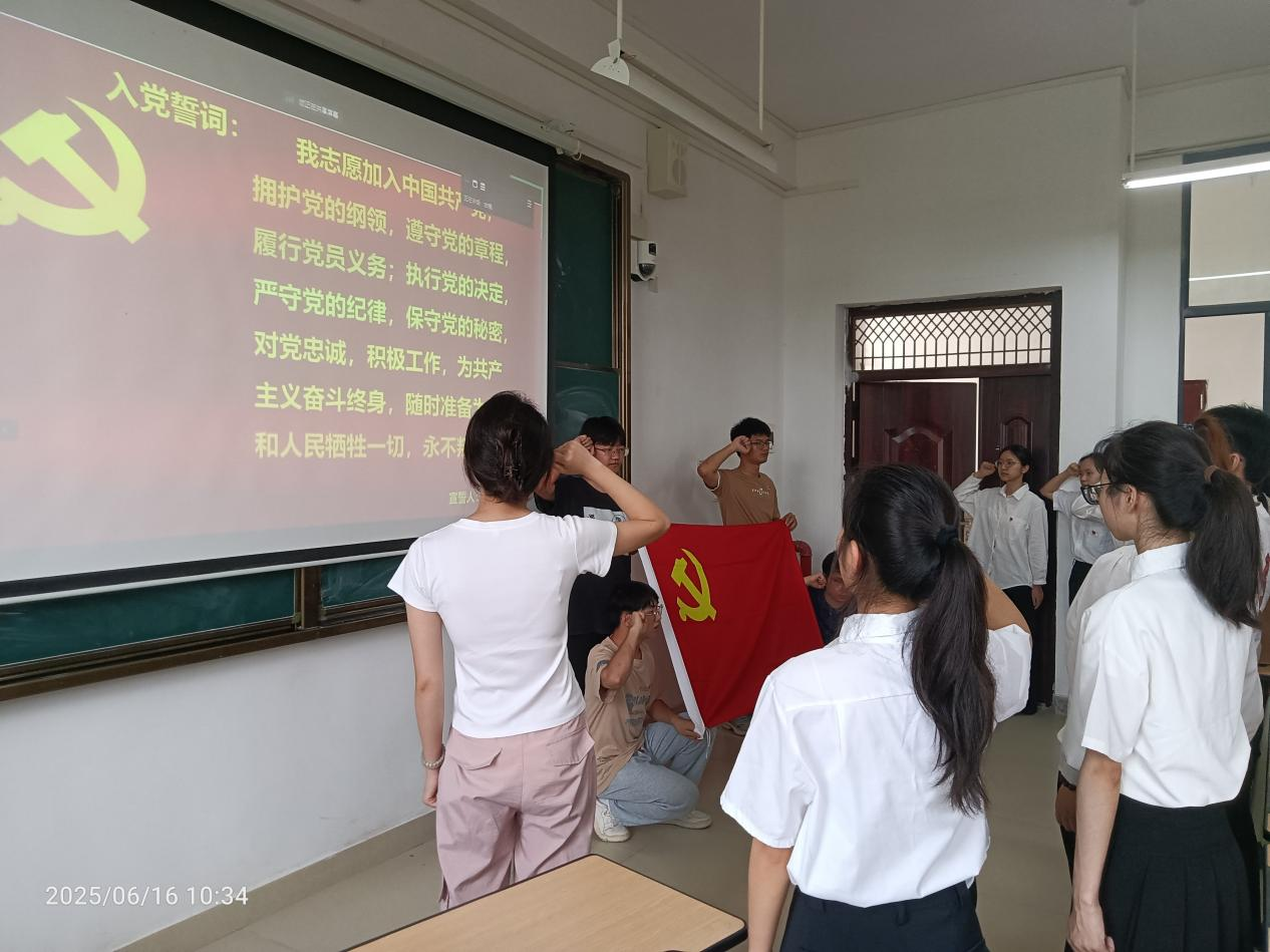 本次会议主要讨论接收范丽妃等15位发展对象成为中共预备党员的事宜。会议伊始,15位发展对象依次宣读入党志愿书,全面汇报对党的认识、入党动机及个人表现,各入党介绍人分别介绍发展对象在培养考察期内的现实表现,明确表达推荐意见。随后,发展对象现场回应党员提问,结合个人思想动态与实践经历进行深入阐述。经无记名投票表决,支部一致同意接收范丽妃等15 位发展对象为中共预备党员。最后,党支部书记黄吉慧同志带领全体党员面对党旗庄严宣誓。