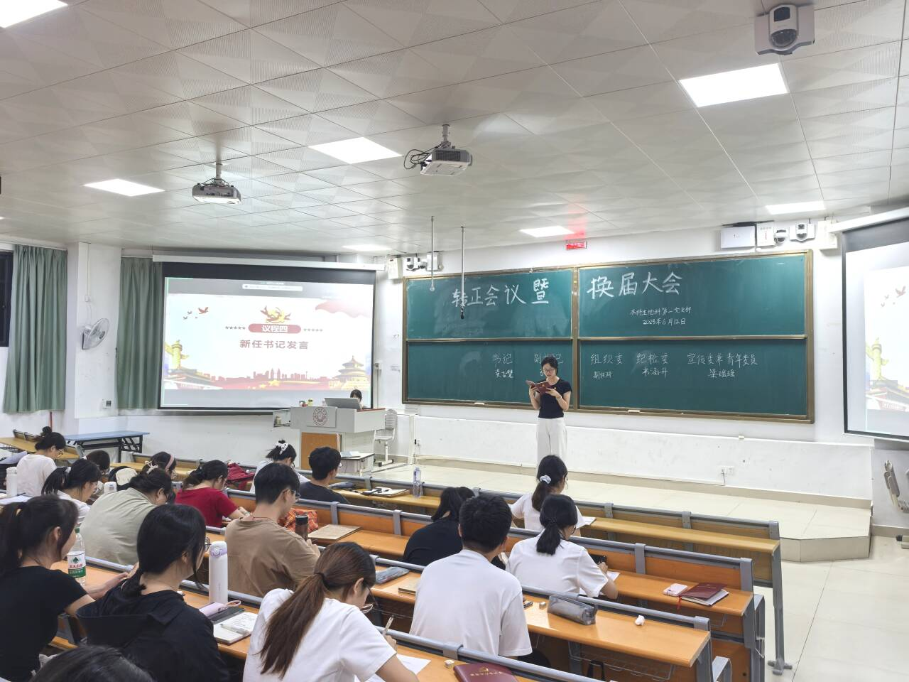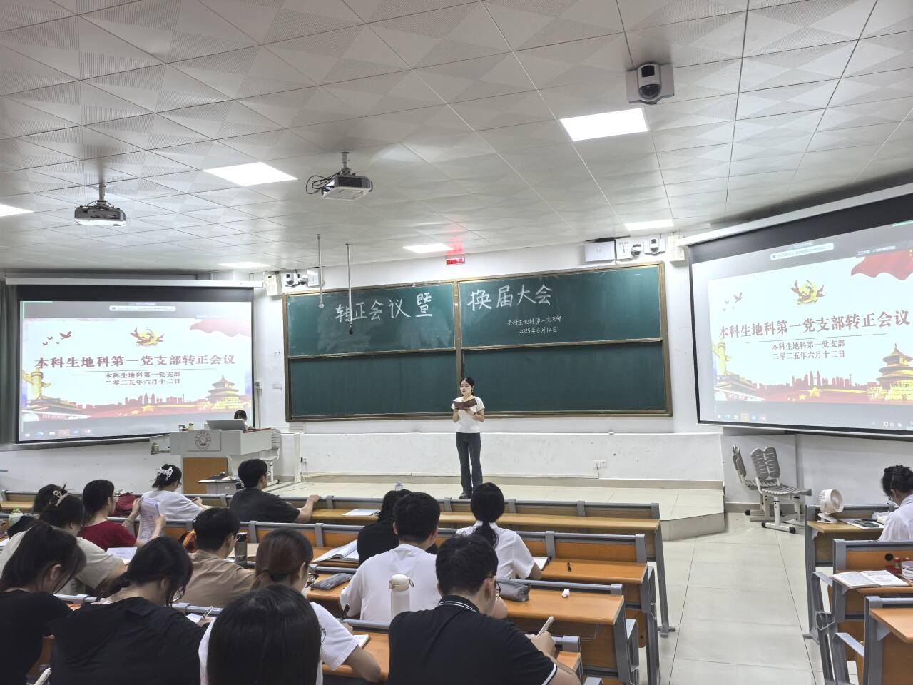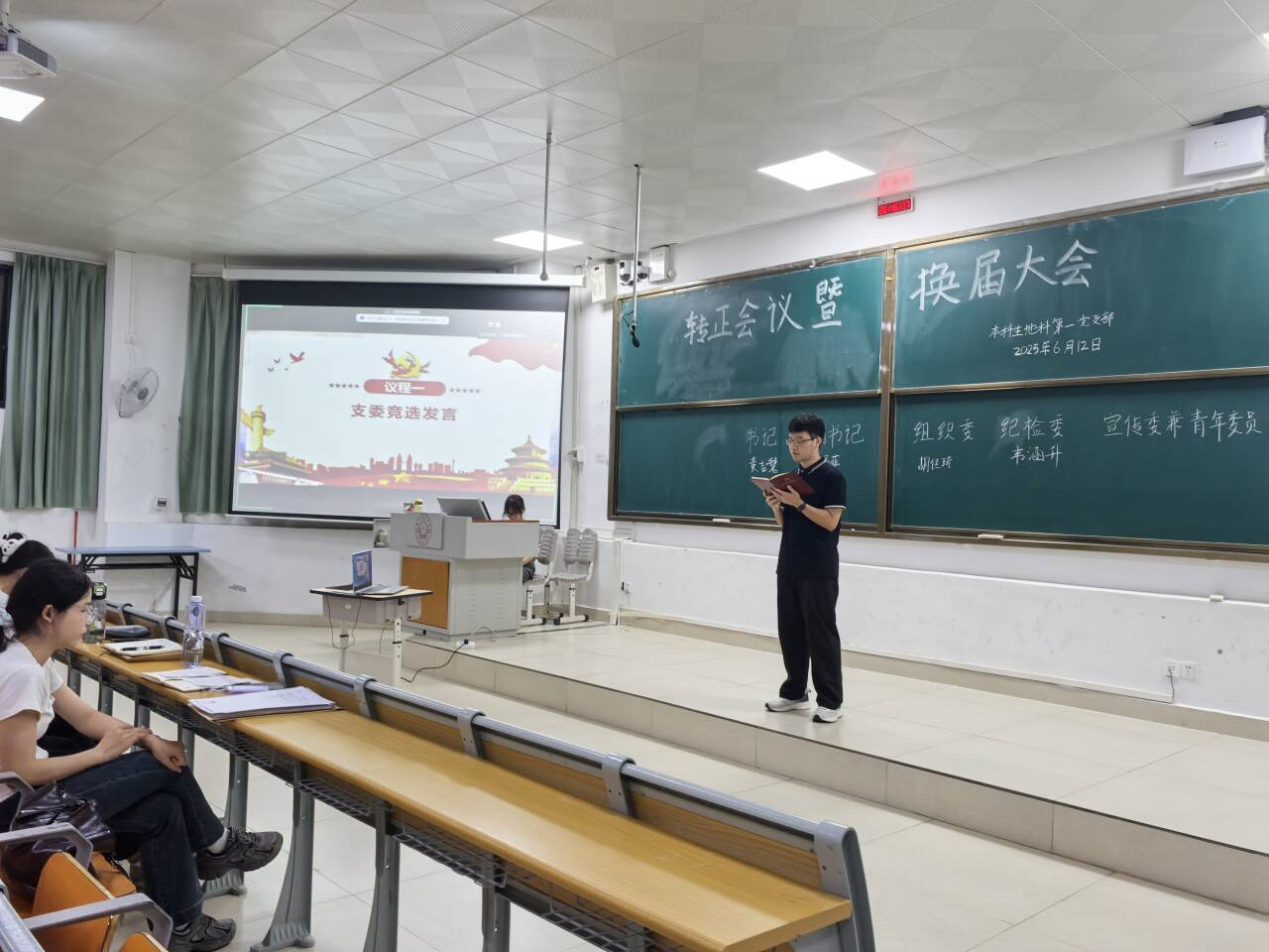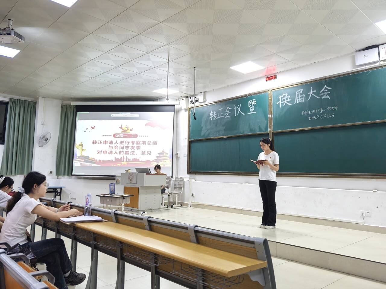 6月12日,6686体育本科生地科第一党支部在武鸣校区1号教学楼114教室顺利召开了2025年6月转正会议暨换届会议。本次会议由党支部书记何爱甜主持,支部全体党员参加。