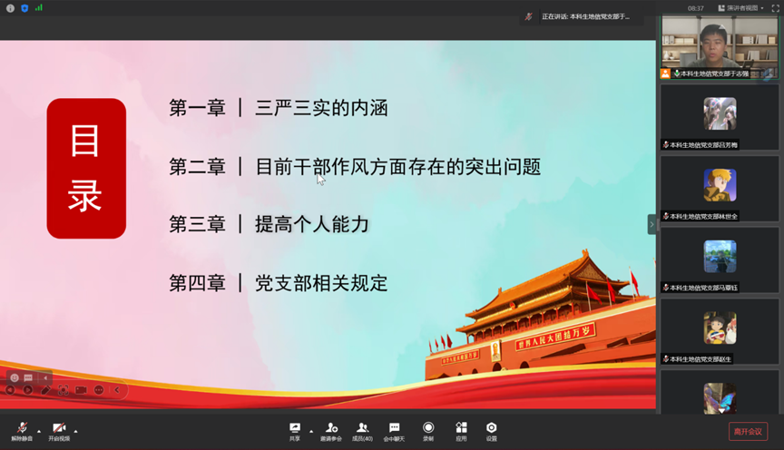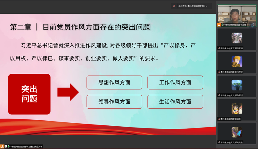 6月28日,6686体育本科生地信党支部于线上开展“不断加强党的作风建设,扎实推进全面从严治党”专题党课学习。此次党课由党支部书记于志强同志主持,支部全体党员共同参与。