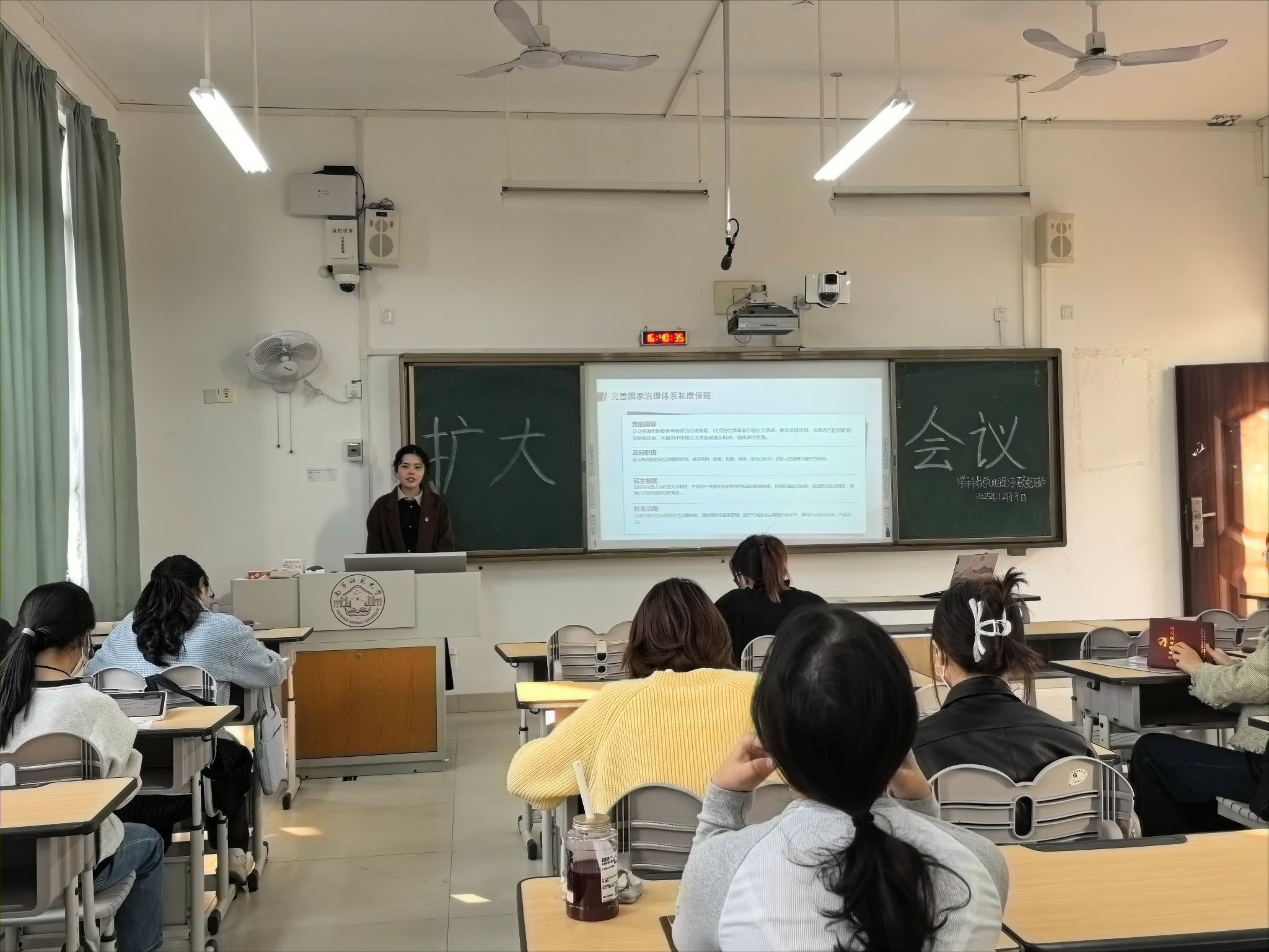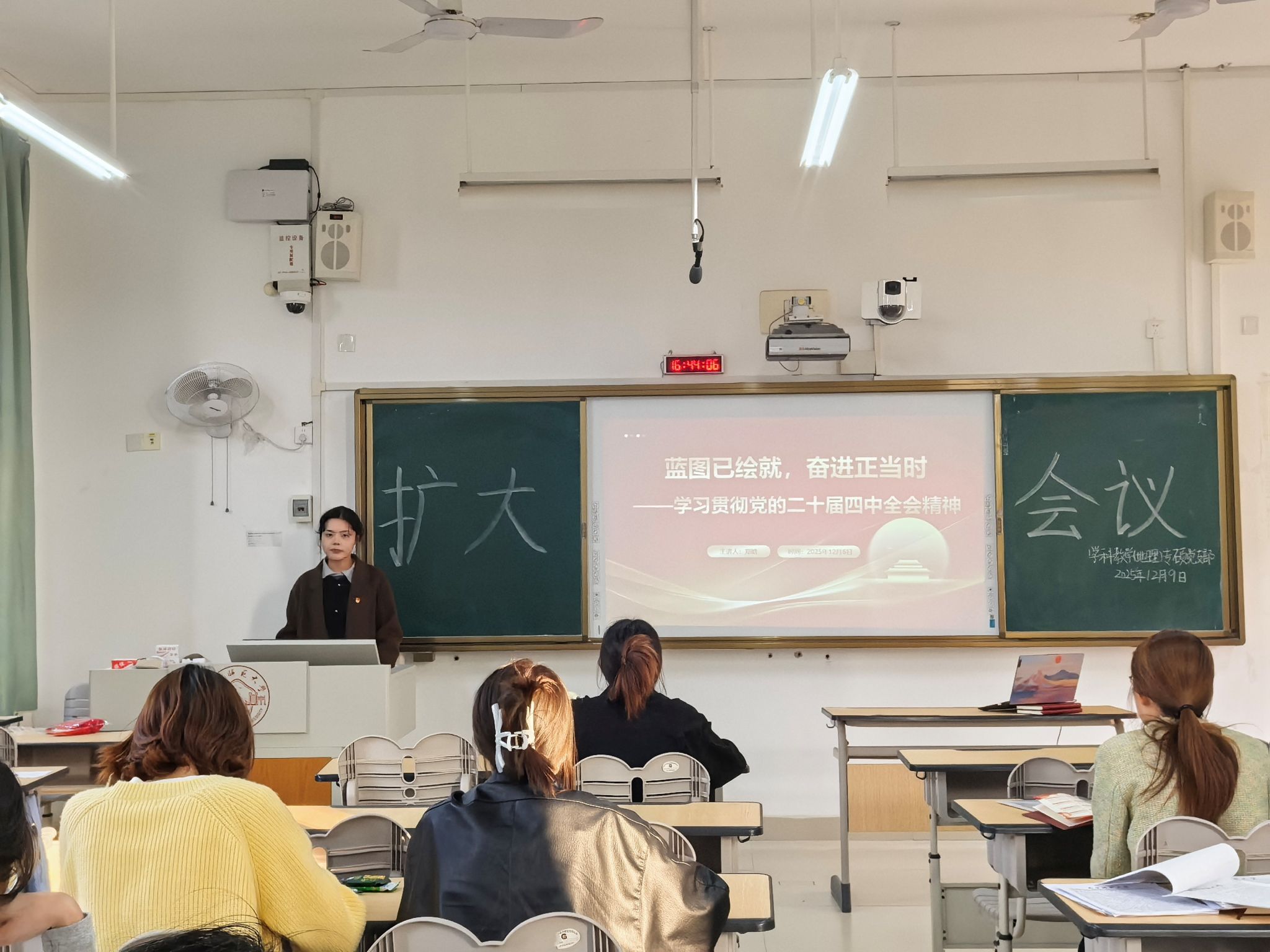 12月9日,6686体育学科教学(地理)专业硕士党支部在武鸣校区1号教学楼201教室召开学习贯彻党的二十届四中全会精神主题会议。此次会议由党支部宣传委员郑晗主持,党支部全体成员参加。